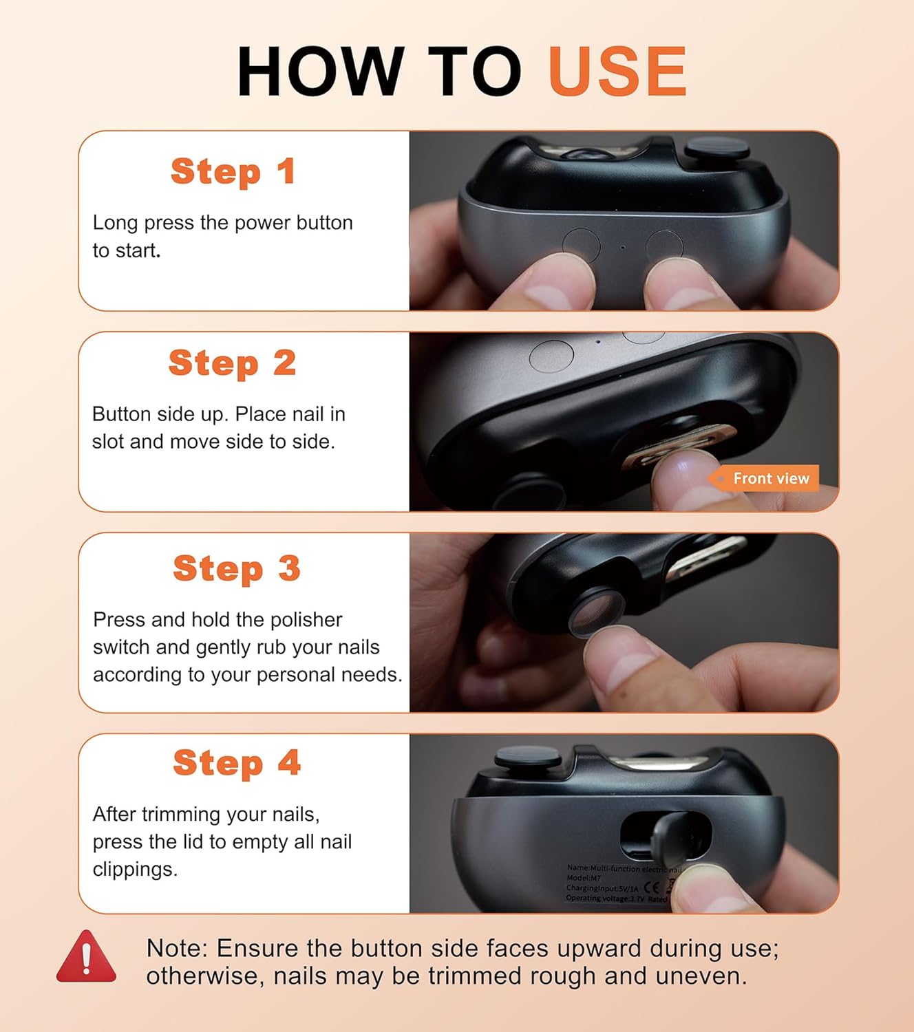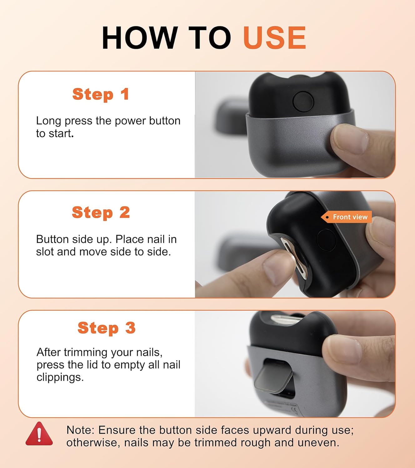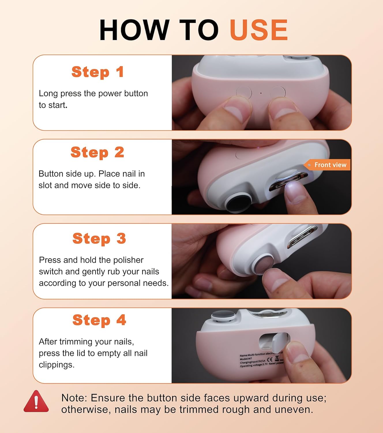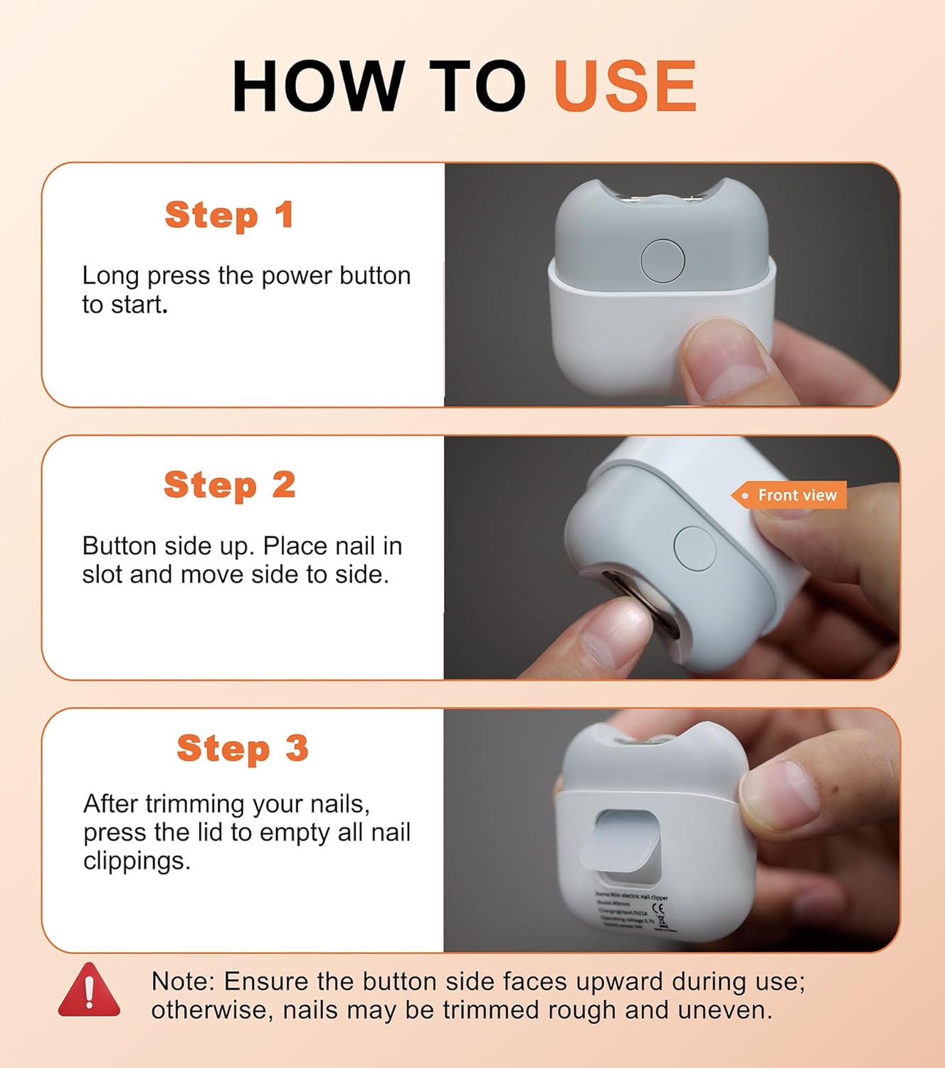 - Easy to use: press and hold the power button for 2 seconds to turn it on. Keep the front of the nail clipper facing up (the side with the button is the front). Simply move the nail clipper gently along the arc of the nail to complete the trimming. It is equipped with a polishing disc that can polish the surface of the nails, so you don't have to worry about sharp nails causing scratches. To replace the polishing disc, just pull out the current one and insert a new accessory.