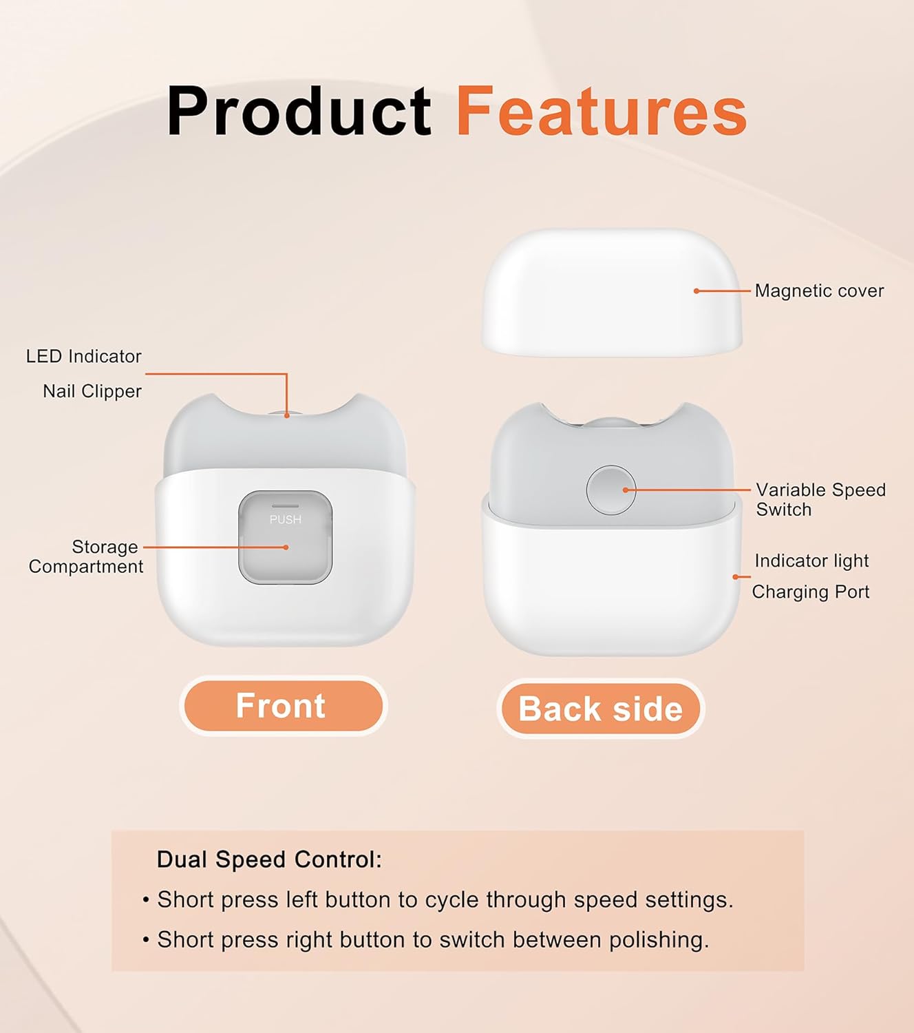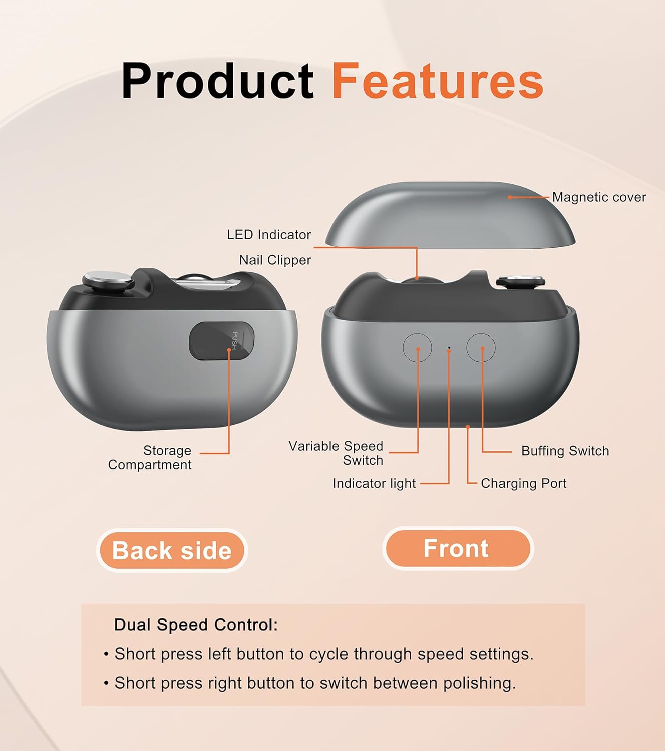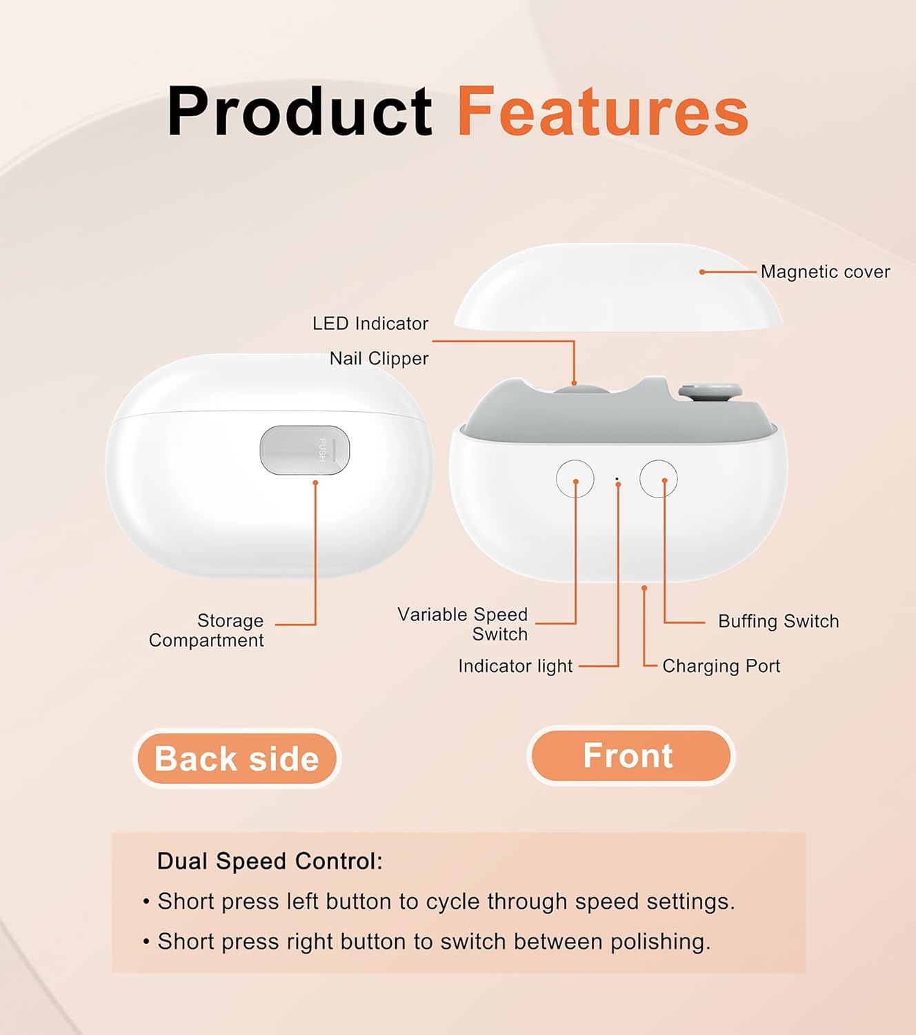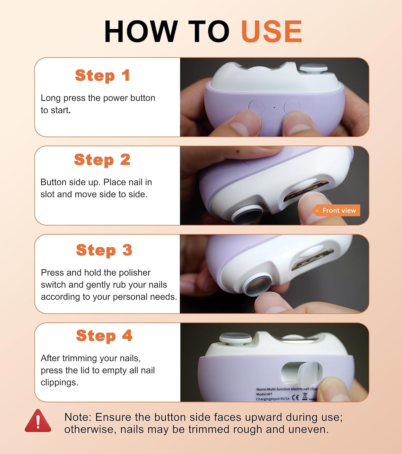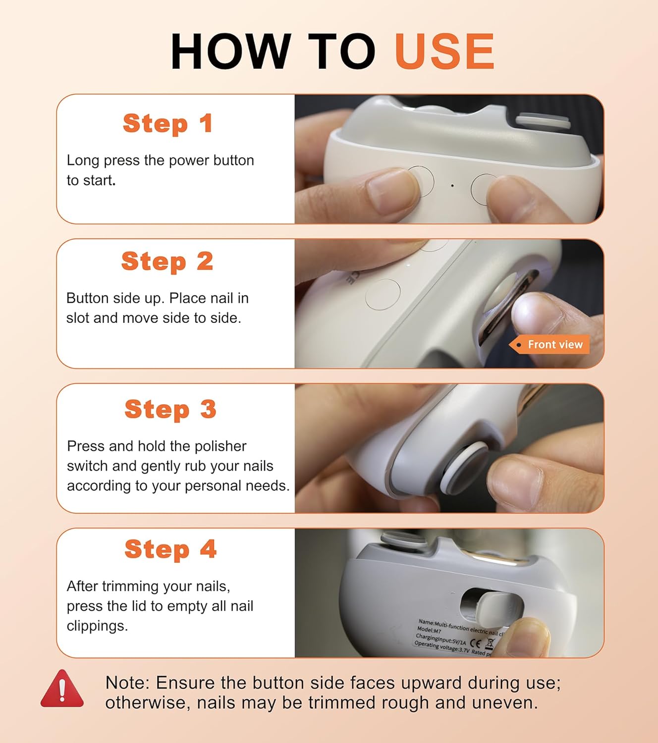 - Easy to use: press and hold the power button for 2 seconds to turn it on. Keep the front of the nail clipper facing up (the side with the button is the front). Simply move the nail clipper gently along the arc of the nail to complete the trimming. It is equipped with a polishing disc that can polish the surface of the nails, so you don't have to worry about sharp nails causing scratches. To replace the polishing disc, just pull out the current one and insert a new accessory.