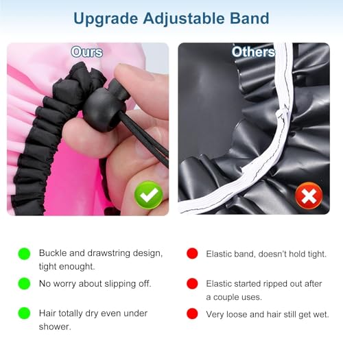 - ??¡¼Adjustable Shower Caps - Ensure Comfortable and Snug Fit¡½The waterproof jumbo shower cap for women features a drawstring to adjust the tightness. You can easily adjust the big shower cap to fit your head circumference and the extra large waterproof shower cap will not slipping off during use for it good stability.