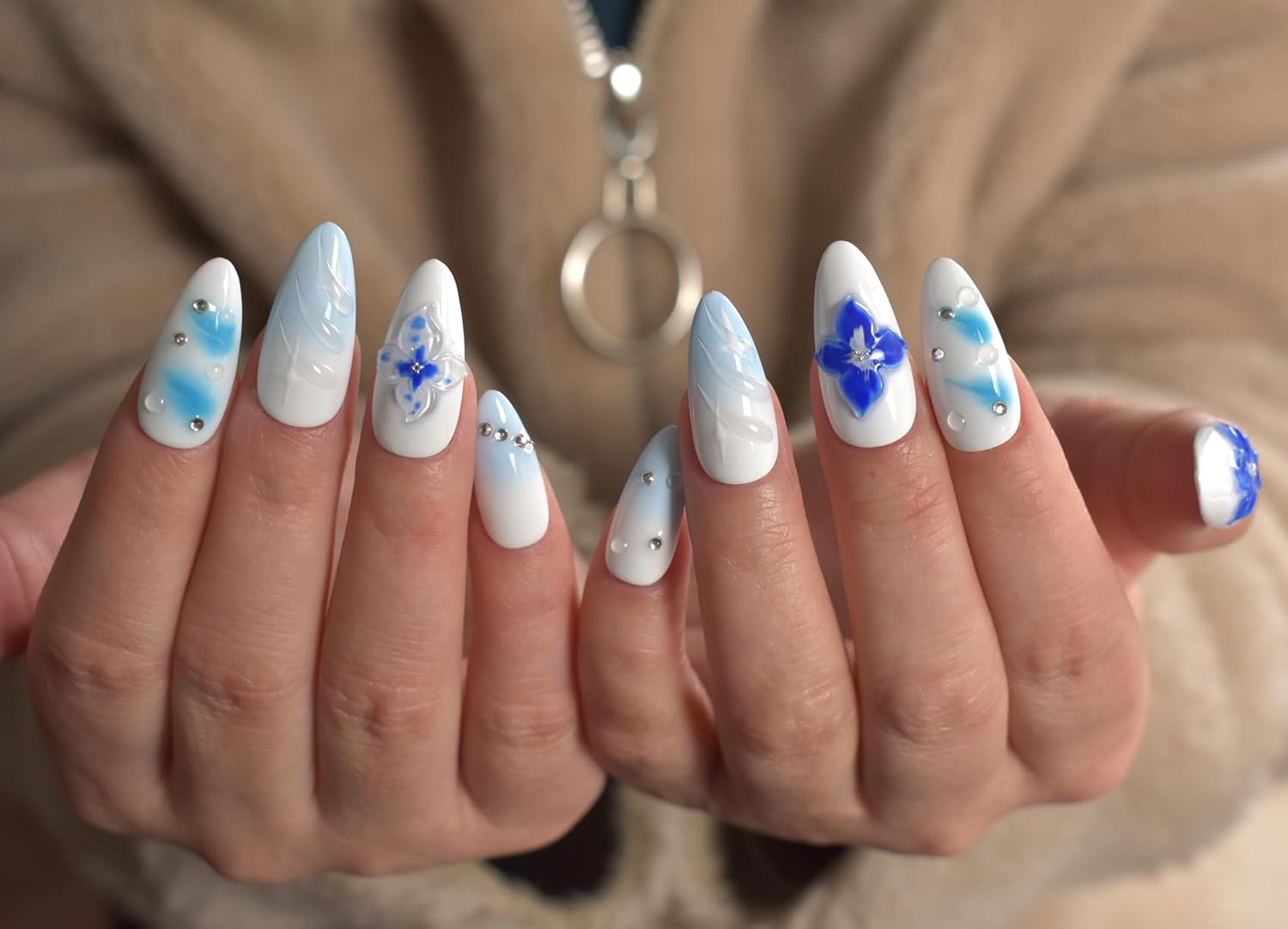 3D Blue Almond Press-On Nails with Carved Flower & Bubble Pearl - Handmade Acrylic Manicure, Medium Size