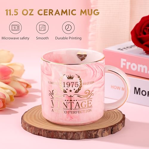 - 50th Birthday Gifts for Women: The coffee cup is designed with elegant marble texture and bright 1975 vintage gold lettering, making it a great gift idea for women's 50th birthday. The 50th makeup bag can hold a lot of items, measuring 10.4''x 7.2''. A three-fold greeting card offers spaces to write heartfelt wishes