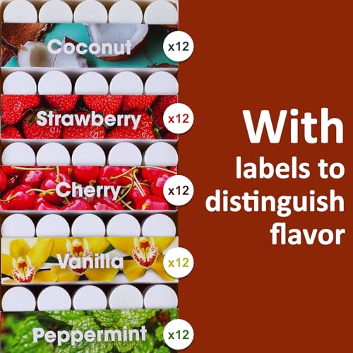 - ¡¼5 Flavors Lip Balm¡½Cherry, Mint, Strawberry, Coconut, and Vanilla. You get 60 tubes with 12 of each flavor. Ensuring you have an ample supply for all of your needs-Labels are built into the box to help distinguish flavors
