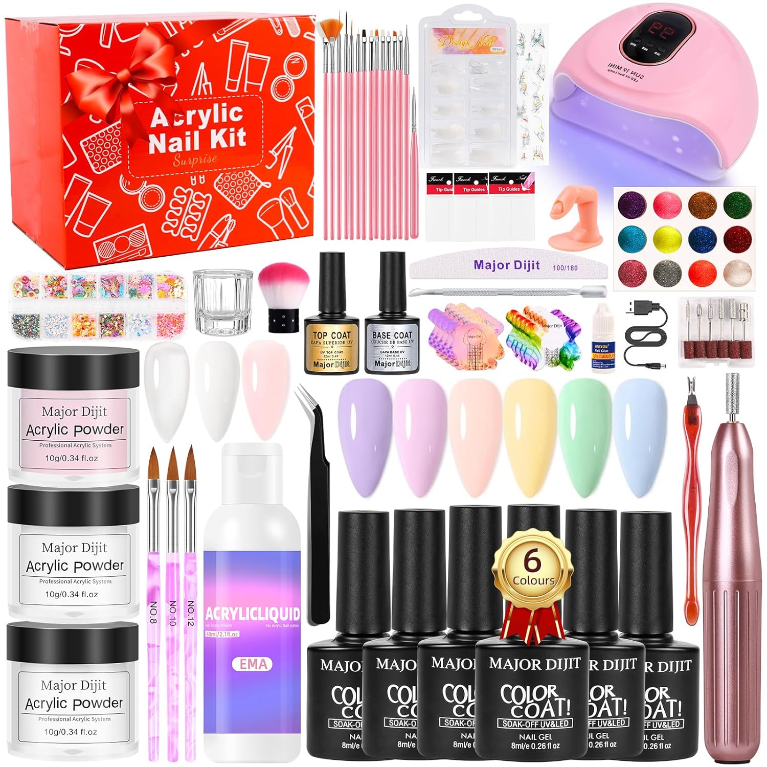 - Acrylic Nail Kit: Includes nail drill with 6 drill bits;3 acrylic powder colors (clear/pink/white);6 gel polish bottles;base & top coat;U V lamp;nail brushes and full set nail art tools.