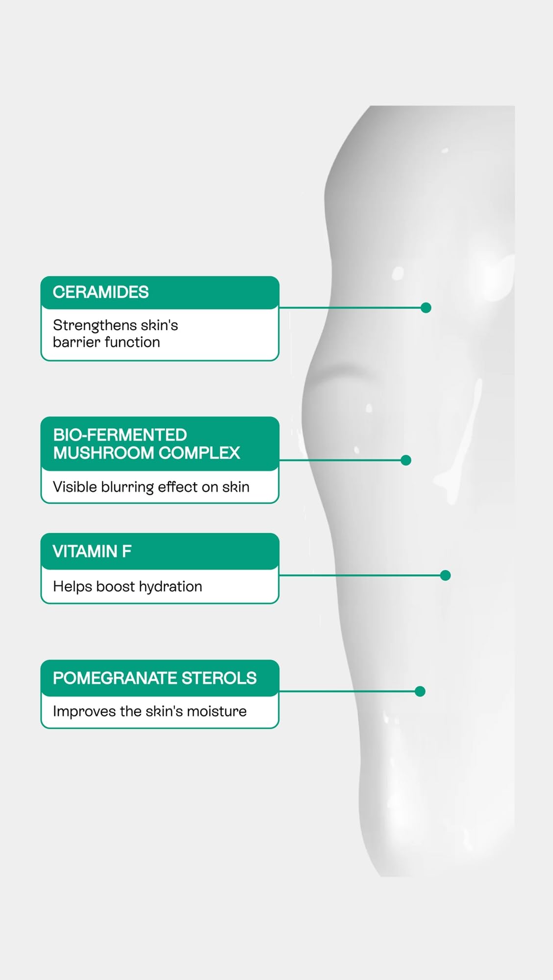 - Key ingredients: Hyaluronic Acid, Bio-fermented Bifidus, Reishi Mushroom Extract, Ceramides, Pomegranate Sterols