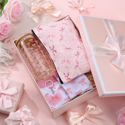 Boao 5 Pcs Pink Bow Gift Set with Glass Cup, Socks, Cosmetic Bag Keychain Coquette Stuff Thank You Gift Box for Girls Women