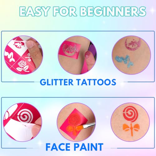 Bowitzki Face Paint Kit with 54 Colors, 8 sheets Stencils, 2 Glitters,10 Brushes, 1 Sheet Gems, Water Based Face Painting Kit, Safe Professional Halloween Party Makeup Set
