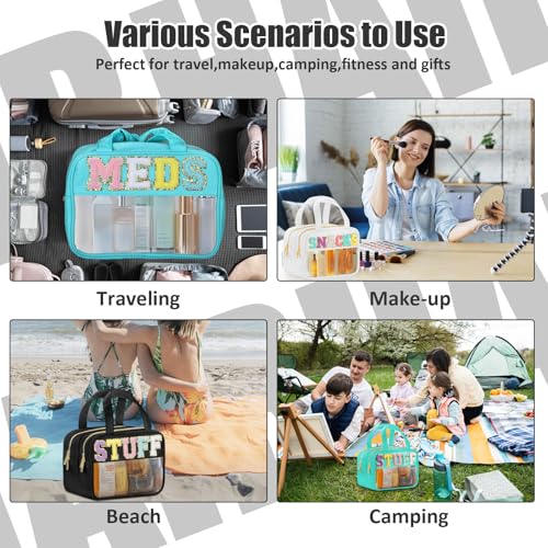 Chenille Letter Clear Makeup Bags Snacks Bag for Travel, Preppy Patch Nylon Cosmetic Pouch with Handles and Zipper, Waterproof Large Clear Travel Toiletry Purse Storage for Women White