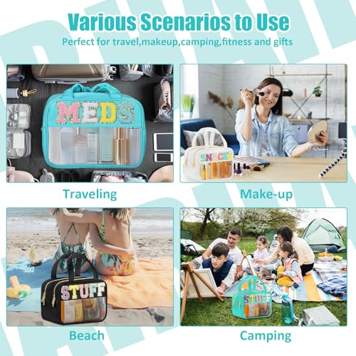 - Stylish Design: This clear makeup bag features a trendy chenille letter 'MEDS' applique and a vibrant teal color that adds a preppy touch to your travel essentials