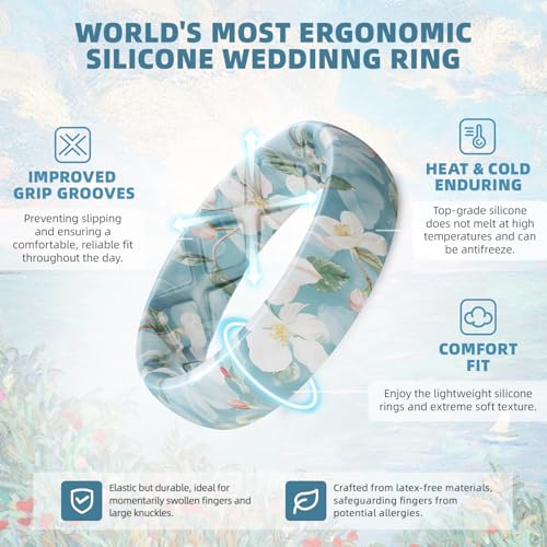 Egnaro Women's Silicone Statement Rings, 5.2mm Wide 2mm Thick Rubber Printed Floral Wedding Bands For Her Size 4-12
