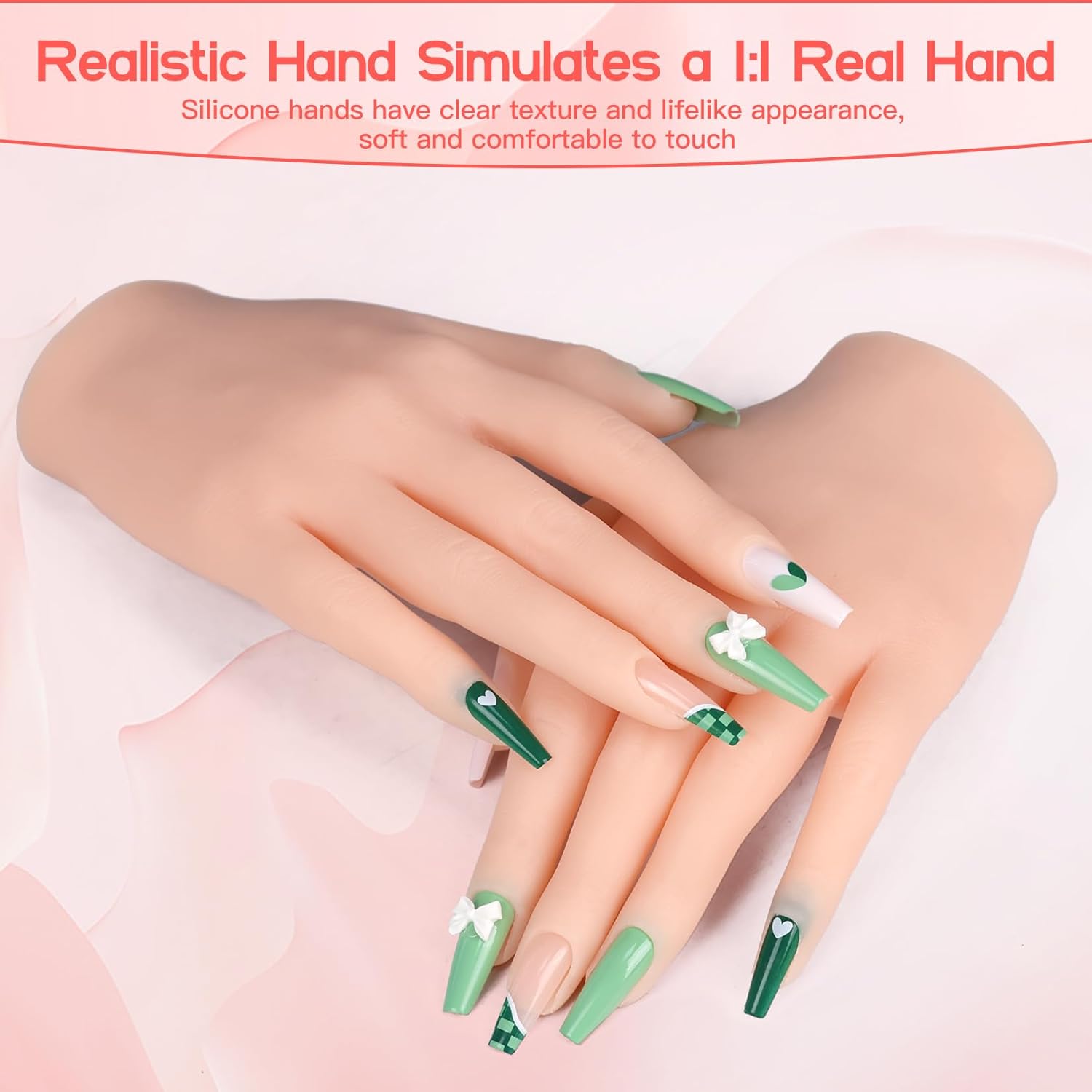 - Practice Hand for Acrylic Nails: Nail practice hand is made of platinum silicone, realistic hand features a skeleton structure and all fingers can be positioned to suit your needs, hand mimics the texture and appearance of a human hand in a 1:1 ratio