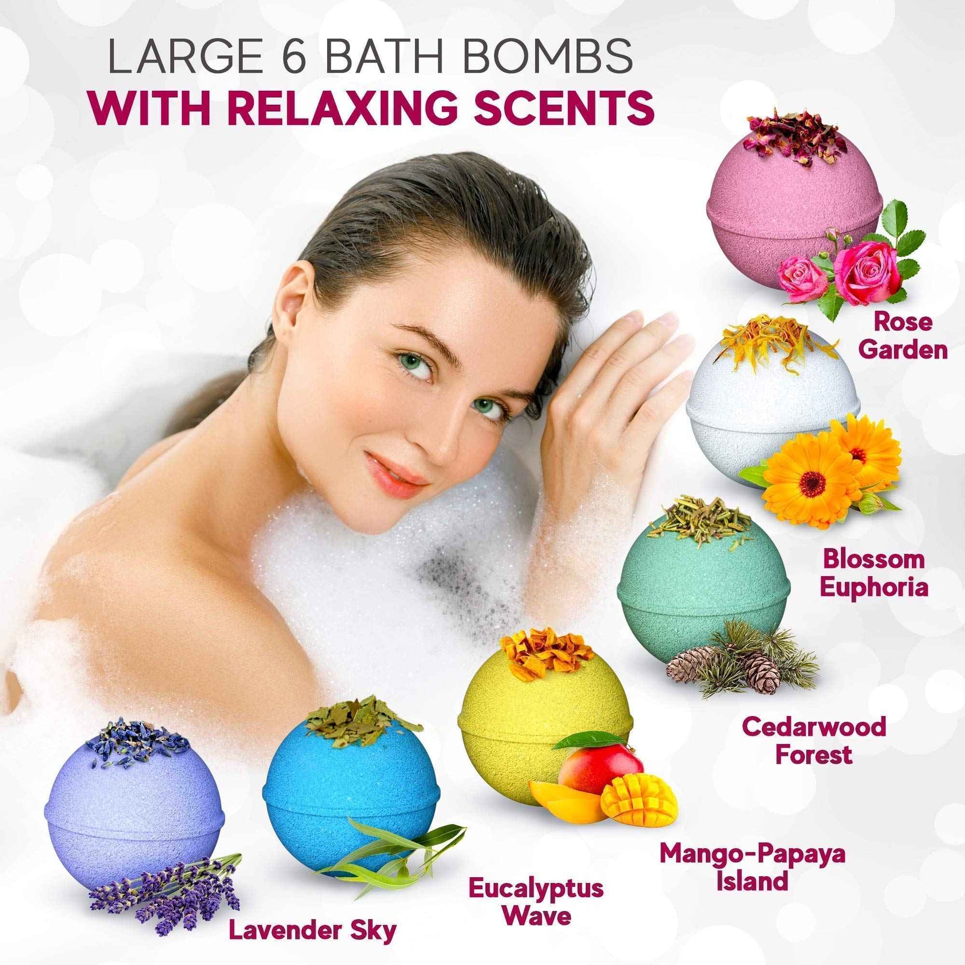 - 6 NATURAL SCENTS: Our gift set of bath bombs includes six natural scents, each designed to provide a unique and indulgent bathing experience. Blossom Euphoria, Eucalyptus Wave, Rose Garden, Lavender Sky, Mango-Papaya Island, and Cedarwood Forest: