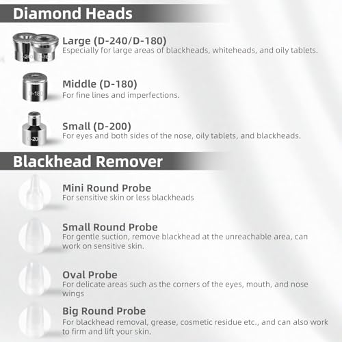 - ¡¼4 DIAMOND TIPS & 4 PLASTIC TIPS ¡½This microdermabrasion machine offers 4 diamond tips and 4 plastic tips for different skin areas. Diamond dermabrasion is for exfoliating, fine lines, and blackheads. Plastic tips are for blackheads, oils, and impurities. This 2-in-1 personal microdermabrasion kit meets all your needs during skincare sessions at home.