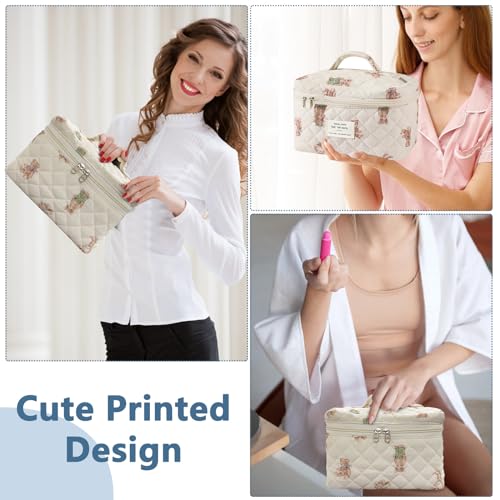 Large Makeup Bag, Cute Cosmetic Bag for Women Girls, Floral Coquette Aesthetic Toiletry Bag, Travel Make Up Organizer Bag (White-Bear)