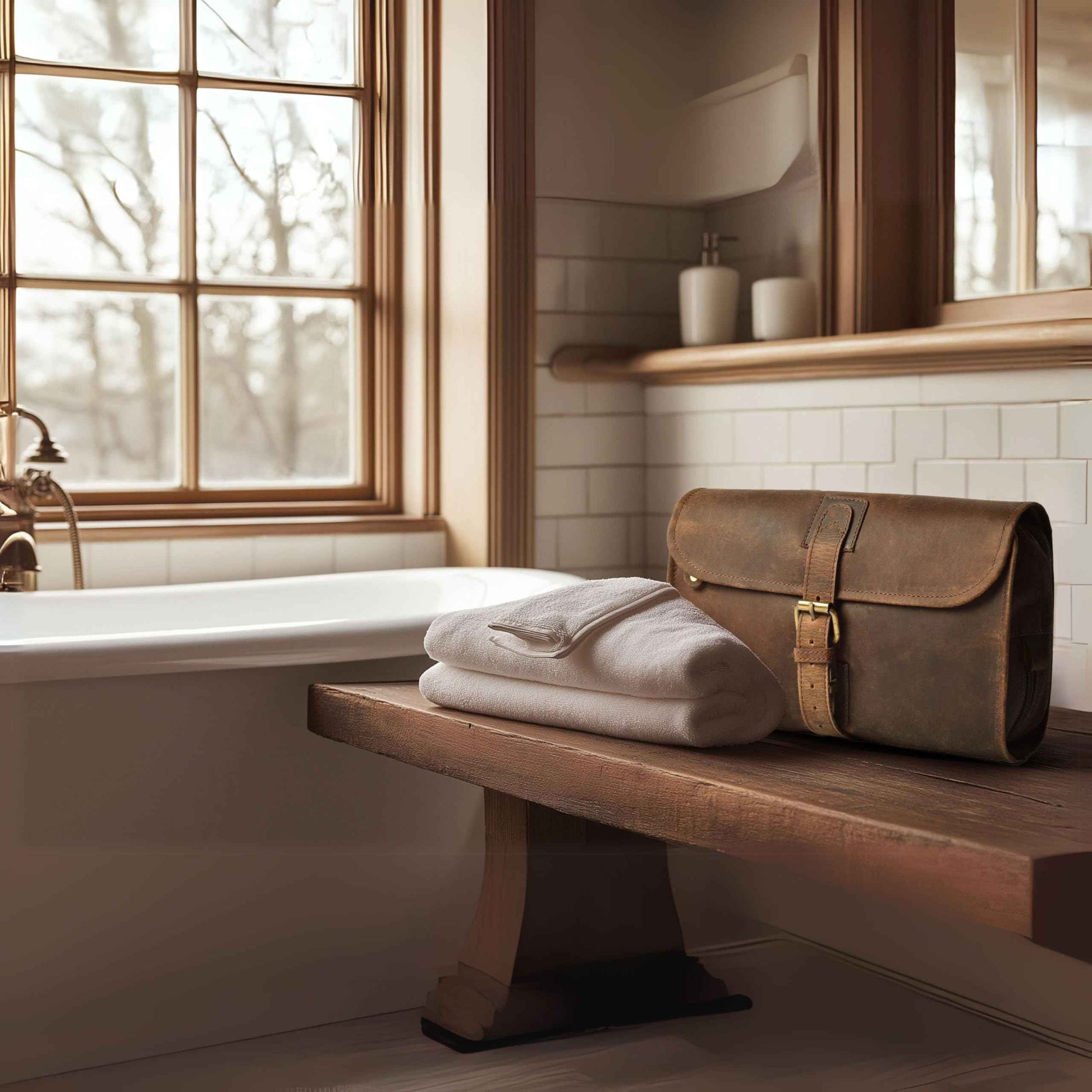 - Secure & Functional Details : Featuring YKK zippers and antique brass fittings, this leather toiletry bag ensures your items stay safe and separate. The brass hook lets you hang it conveniently, keeping counters clutter-free in any hotel or bathroom setup.