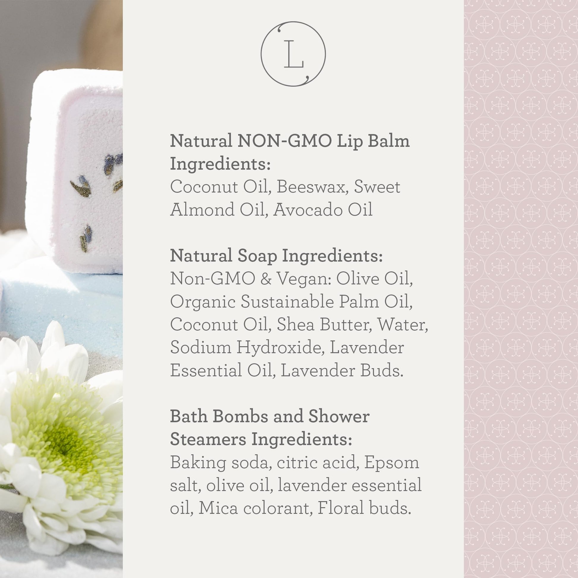 - INCLUDES: All-natural bath set includes: ❀ Lavender natural soap bar ❀ Body Scrub ❀ Shower Mist ❀ Body Oil ❀ Candle ❀ Clay facial mask ❀ Natural lip balm ❀ Cosmetic Bag ❀ Soap saver ❀ Gorgeous box