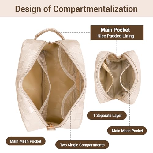 MAGEFY 2Pcs Makeup Bag, Cute Checkered Pouch with Handle, Leather Travel Makeup Pouches for purse Make Up Bag for Cosmetic, Lipstick,Beige