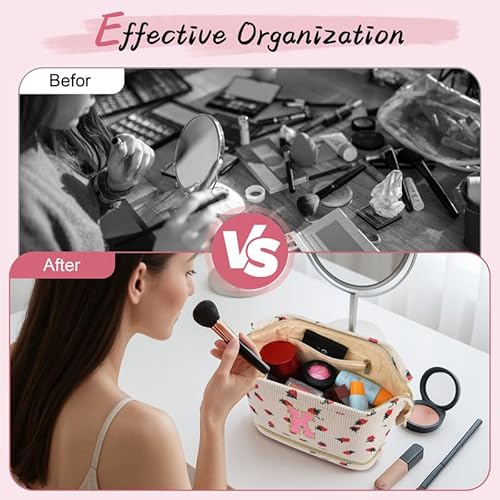 Personalized Initial Makeup Bag,Strawberry Quilted Makeup bag Christmas Gifts for Girls,Double Layer Travel cosmetic Bag with Make up Brush Organizer,Cute Travel Toiletry Pouch-I