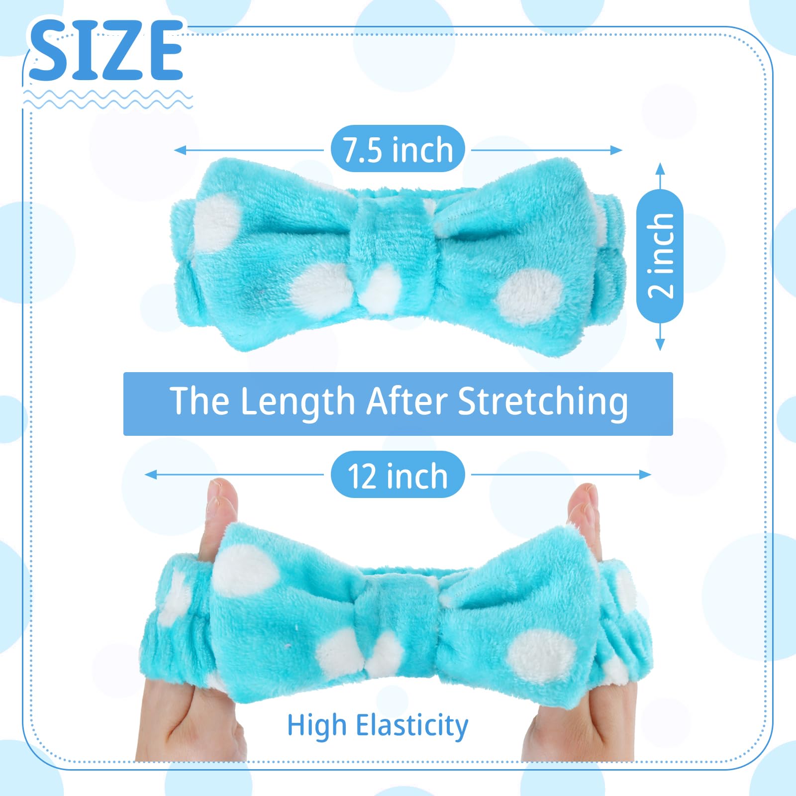 - Adjustable Size: the skincare headbands are designed with elasticity in mind to accommodate various head sizes; The headband that starts at 7.5 inches can comfortably stretch up to 12 inches, ensuring a secure yet comfortable fit for most individuals; The elasticity also makes them suitable for various activities such as face washing, makeup application, or even yoga sessions