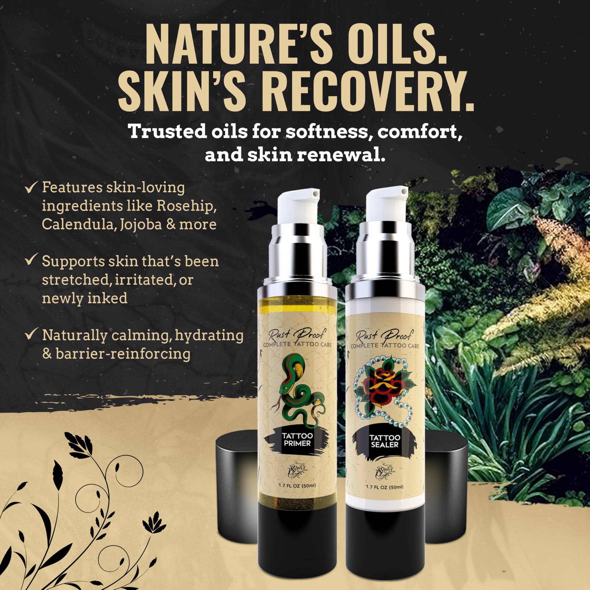 - COMPLETE TATTOO CARE KIT - The Rust Proof Complete Tattoo Care includes our Tattoo Primer (Skin Repair Oil) and Tattoo Sealer (Moisture Sealing Lotion) for full-spectrum care. Use them to keep tattooed skin hydrated, smooth, and supported before and after ink.