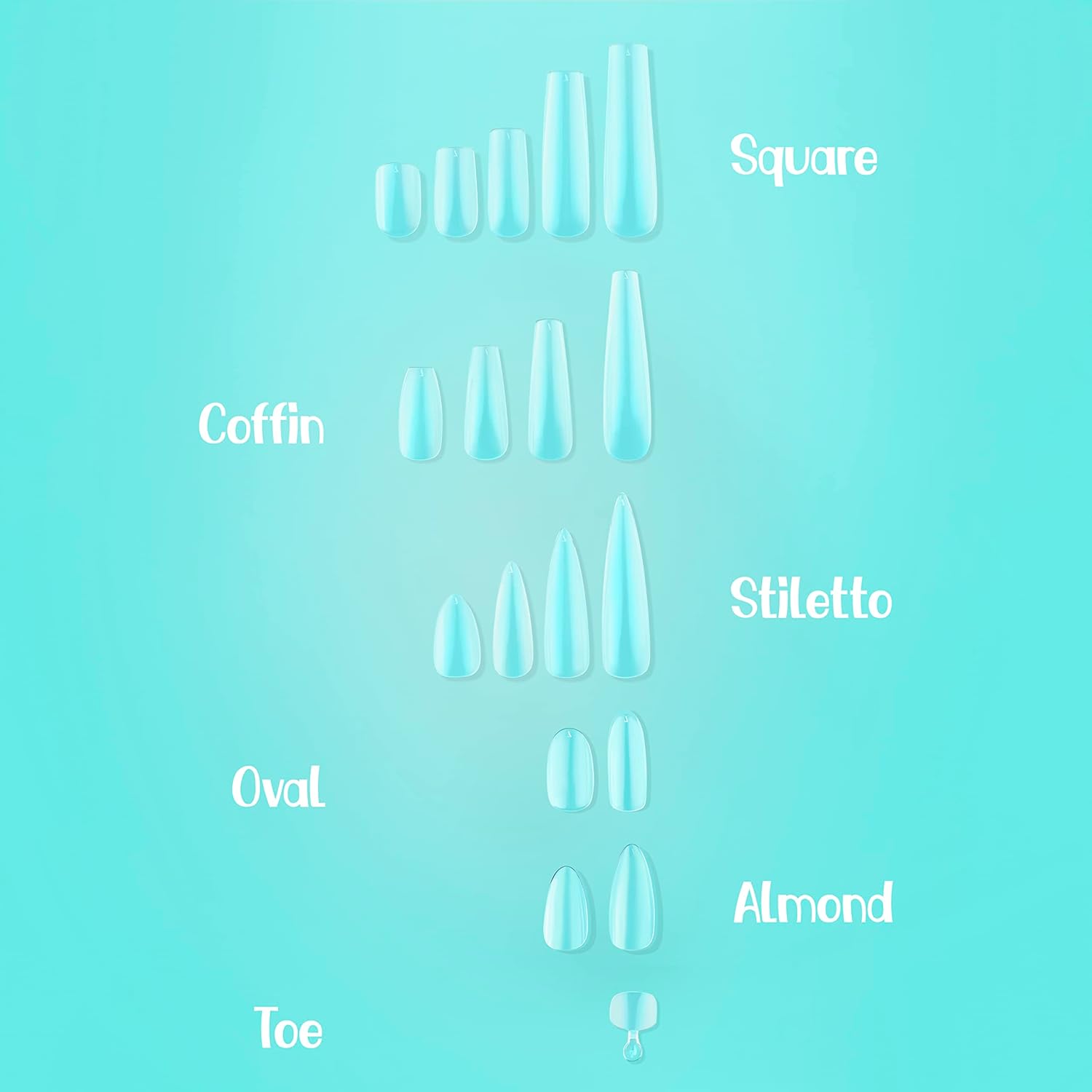 Almond Medium, Short, Coffin Short, Coffin Medium, Coffin Long, Coffin XL, Square Short Medium, Long, Stiletto Short, Medium, Long, XL