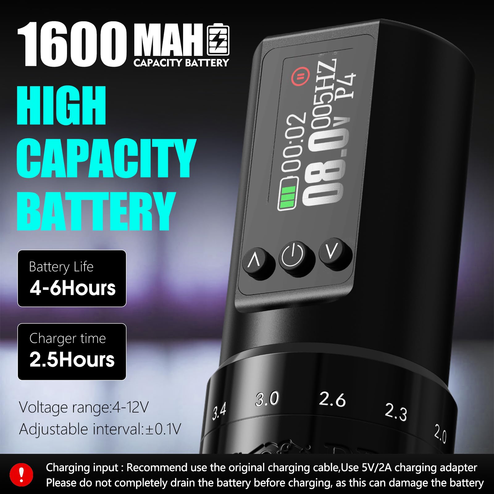 - LED Display & Easy Controls: Features an intuitive LED display for easy voltage adjustment, battery life monitoring, and timer settings. The anti-slip grip ensures comfort and control during long sessions. Double-click the power button for jump start, and long press for standard start. In active state, double-click to switch to dot work mode. In dot work mode, short press to adjust frequency, and long press to adjust voltage.