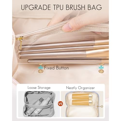 - Multiple Compartments: 2 large sections + 3 elastic pockets organize makeup/skincare. Middle zippered TPU pocket for small items; extra brush pouch keeps tools tidy and visible