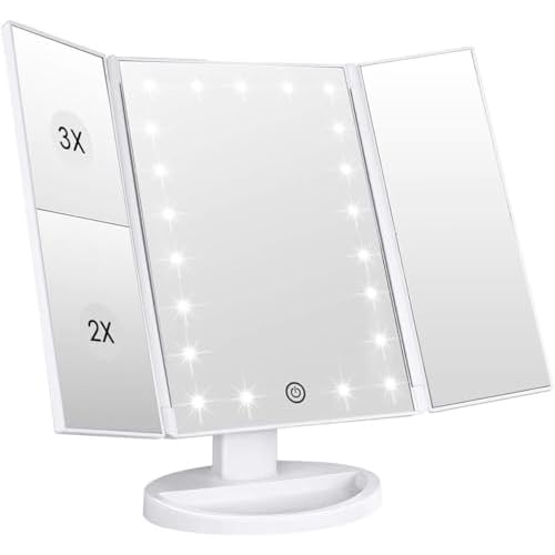 WEILY Makeup Vanity Mirror with 21 LED Lights and Touch Screen, Tri-Fold 1x 2X 3X Magnification,180¡Æ Adjustable Rotation and USB Powered,Countertop Cosmetic Mirror (White)
