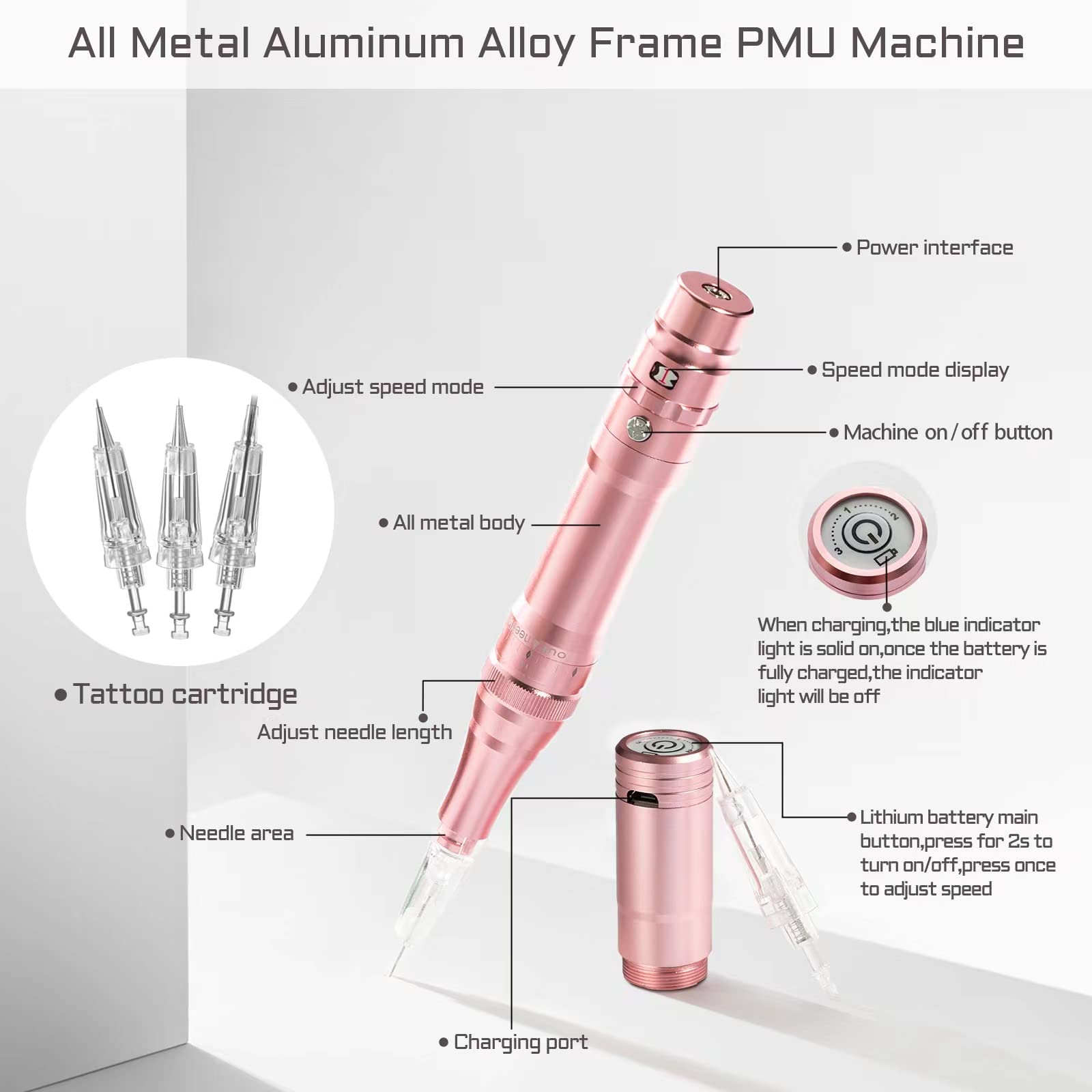 Whalrace PMU Machine, cordless Permanent Makeup Machine Kit with 10 PMU Needles & 1 Lithium Battery, Tattoo Machine Microblading Machine for Eyebrows, Lips, Eyeliners - Rose Gold