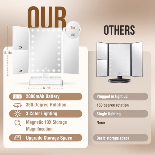 Wireless Rechargeable Lighted Makeup Mirror with 3 Color Lighting, 2000mAh Rechargeable Battery, 10x 3X 2X Magnification, 24 LED, 360 Degree Rotation, Gift for Woman (White)