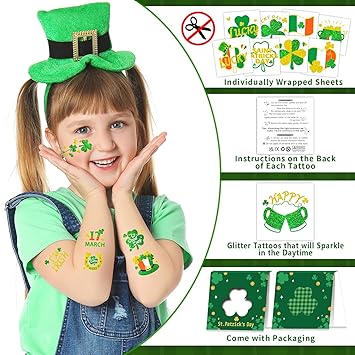 - 【Glitter and Waterproof Fake tattoos】These glitter St Patrick's Day tattoos will attract everyone's attention! Our temporary tattoos undergo rigorous party testing, the fake tattoos will not come off easily and will stay on the skin all day or longer.