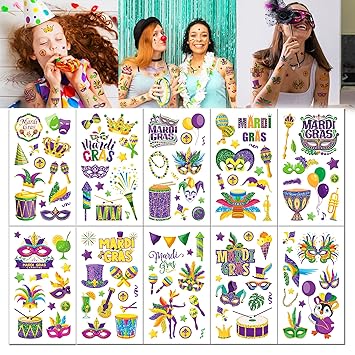 The Konsait 10 sheet Mardi Gras temporary tatoos are well designed with mardi gras theme designs and intricate details. These tattoos have vibrant colors, classic designs like masks, jester hat, fleur-de-lis, Mardi Gras, crowns, musical instruments, suitable for both kids and adults, would be great mardi gras accessories.