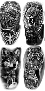 8 Sheets Realistic Animal Temporary Tattoos Stickers Black Gray Forest Lion Wolf Tiger Compass Cross Poker Card Warrior Men Waterproof Arm Leg Fake Body Art