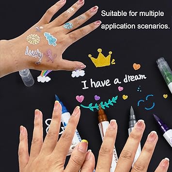 - 𝗦𝗮𝗳𝗲𝘁𝘆:These temporary tattoo pens are crafted from water-based cosmetic-grade ink, making them gentle on the skin and non-irritating. Their lightweight pen design ensures easy handling, and they can be easily removed with soap and warm water.