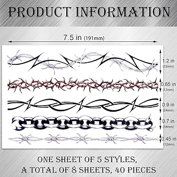 - Package Include - You will receive 8 sheets (40pcs in total) fake barbed wire tattoos stickers, each sheet has 5 different styles. The barbed wire tattoo stickers can meet your various body art tattoo needs and share with others.