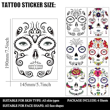 - NO HARM TO SKIN & WATERPROOF - Includes 6 sheets sugar skull full face tattoo. These colorful face stickers are made of eco- friendly materials and Non-toxic, phthalate free,harmless and safe for your face. 100% waterproof and sweat-proof, tattoo may last for 2-5 days.