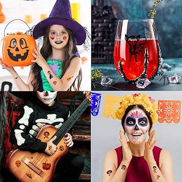 - Halloween Party Favors: Skull tattoos great for Mexican party, Cinco de Mayo celebration, Day of The Dead (Dia De Los Muertos), Halloween carnival party cosplay. Not only decorating to the child's face, hands, arms, back, legs, body, but also can be used to decorate mugs, computers, children's thermos cups, notebooks, TV, refrigerator, shoes and other surface surfaces you want.