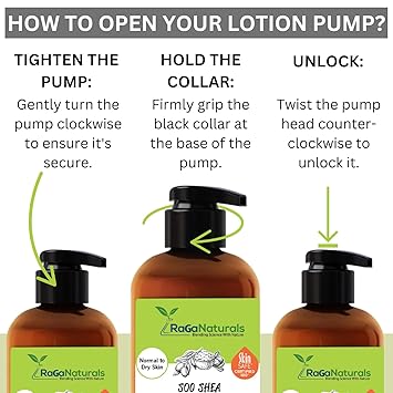 - Pro Pump Tips: Hold your lotion bottle firmly, while holding the small black plastic circle right below the pump's neck tightly, use your other hand to turn the pump counterclockwise so it unlocks, follow the arrow on the top. This pump will 'pop up' once it’s been unlocked. If you have any issues with your purchase, contact the RaGaNaturals Customer Care team and we’ll make it right!