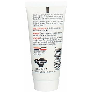 UdlderySmodoth Extra Care 20 Hand and Body Cream Unscented contains 20% Urea to enhance moisturization and provide extra soothing strength for dry, stressed skin. Extra Care 20 absorbs quickly, smooths roughness and softens dry skin. Udderly Smooth products were originally developed for dairy cows. Now, Uderly Smooth products are being used by people around the world. Extra Care 20 Hand and Body Cream Unscented is cruelty free, fragrance free, and made in the USA.