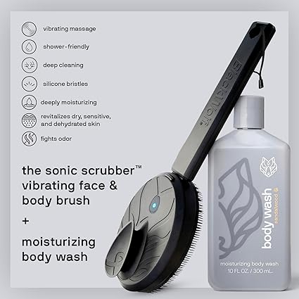 - Elevate Your Shower Experience: Keep your skin fresh and healthy with Black Wolf’s Sonic Scrubber Pro and Body Wash Kit. The Sonic Scrubber Pro is a vibrating 2-in-1 face & body brush, offering a deep clean and gentle massage. It pairs perfectly with the Charcoal Body Wash to make your skin look and feel amazing all day, every day. Includes 1 Sonic Scrubber Pro and 1 Charcoal Body Wash (10 oz / 295 ml).