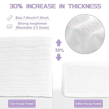 - 【DOUBLE-SIDED DESIGN】 Face towels disposable 7.9 x 7.9 inches, one side adopts concave-convex pearl pattern design to increase friction for deep cleansing; The other adopts smooth & soft contact surface for wiping skin. Smooth side for early morning without makeup and bumpy side for night time with heavy dirt and makeup, keep fresh and clean skin at all times