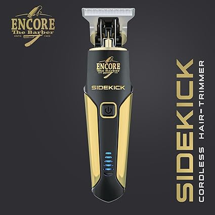 ENCORE THE BARBER Sidekick Cordless Trimmer is an ergonomically designed, professional barber grade trimmer. Built with the needs of the professional barber in mind, this machine is sturdy, lightweight, has a 1.5 Hours run time, a battery level indicator, fully charges in 90 minutes, and comes with an extra set of T-blades for added peace of mind. ENCORE THE BARBER Sidekick Cordless Trimmer is tested and approved by real Barbers to ensure high quality craftmanship standards. The Sidekick earned it's name by being just that, your handy sidekick for debulking, creating and cleaning up guide lines, pre-shaving, and countless other tasks, all while being gentle on the skin and scalp.