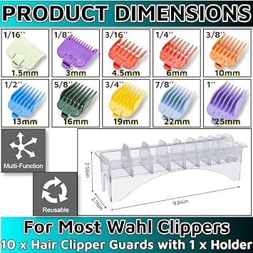 - 【10 Cutting Length Options for Precision】: The barber guards set offers 10 different cutting lengths and 1 holder, ranging from 1/16”to 1”, allowing you to achieve a wide variety of haircuts, from close trims to longer styles. The color-coded design ensures quick and easy identification of each guard, making it simple to select the right length for your needs, whether you're doing fades, buzz cuts, or regular trims. These guards for clippers provide versatility and precision with every use.