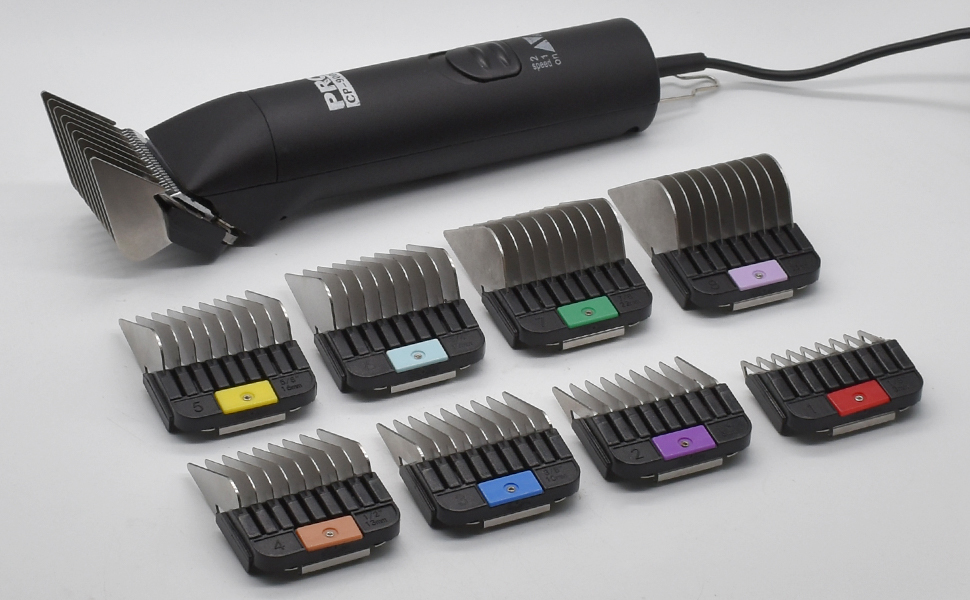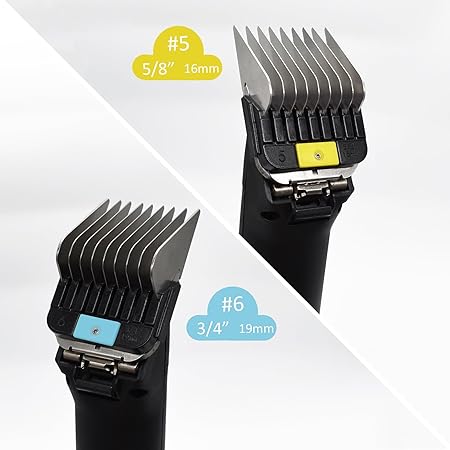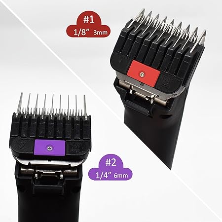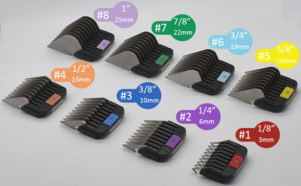- The package comes with 8 pieces of color-coded attachment guard combs, #1(1/8-3mm), #2(1/4"-6mm), #3(3/8"-10mm), #4(1/2"-13mm), #5(5/8"-16mm), #6(3/4"-19mm), #7(7/8"-22mm), #8(1"-25mm)