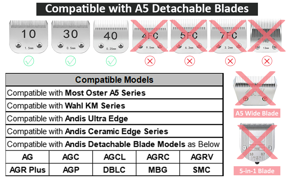 - Compatible with Wahl KM2/5/10/Cordless, Oster A5, A6, Golden A5, Turbo A5, Power Max and Andis AG, AGC, BG, BGR, BGRC, BDC, DBLC, FHC, MBG, SMC, SMX and most A5-Style detachable blade animal hair clippers
