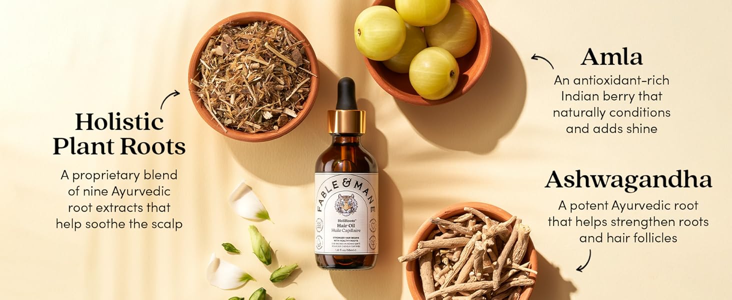 Fable and Mane Hair Oil - HoliRoots Strengthening Serum for Damaged, Frizzy with Ashwagandha, Castor & Scalp Treatment 1.8FL oz