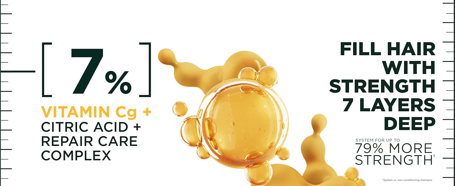 Our sulfate-free Hair Filler + Vitamin Cg system, formulated with Vitamin Cg + Citric Acid + Repair Care Complex, fills weak, damaged hair with strength. Fill hair with strength 7 layers deep with our system for inner fiber repair, outer visible transformation. INNER: Repairs and strengthens broken bonds deep in the cortex, hair fiber's inner layer*. OUTER: Up to 4x stronger hair with up to 79% less breakage.** Visibly smooth and healthy-looking hair. Formulated without sulfates, parabens, phthalates, DMDM Hydantoin, drying alcohols, and mineral oil. Additionally, all Garnier products, globally, are officially approved by Cruelty Free International under the Leaping Bunny Program. *repair & strengthen broken bonds inside the hair fiber with continuous use of system **with continuous use of system ***with use of system vs. non-conditioning shampoo