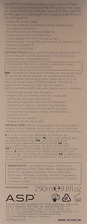 Kitoko Oil Treatment is an indulgent blend of Karite and Argan oils richer in antioxidants Omega oils and Vitamins A and E than other oils. This sensory oil treatment is perfectly balanced to the hair and scalp resulting in incredible absorption and rapid penetration without adding weight to the hair. Essential fatty acids nourish the hair from within to stimulate incredible condition elasticity and shine. Kitoko Oil Treatment will not only revive tired hair but will help neutralise free-radicals and protect the hair from environmental and chemical damage. Simply massage a few drops of oil into the palm of your hands and apply evenly to damp or dry hair. Comb through from roots to ends to ensure an even distribution. Do not rinse off. Style as usual.