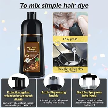 - Save Money And Time : Hair dye and hair care 3 in 1 for men and women can dye hair just at home,no more hair salon visits. 500ML light brown shampoo for grey hair is available for around 20-25 applications,which can light on your pocket. The light brown dye color shampoo is very suitable to give parents and elders as a gift.