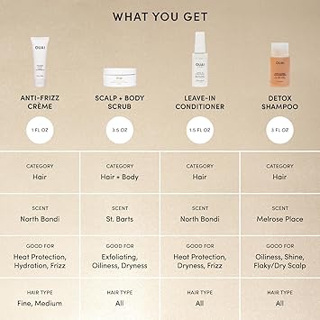 OUAI Gift Set - Travel Size Hair & Body Care Includes Detox Shampoo, Deluxe Anti Frizz Cream, Leave In Conditioner, Scalp Scrub (4 Count)