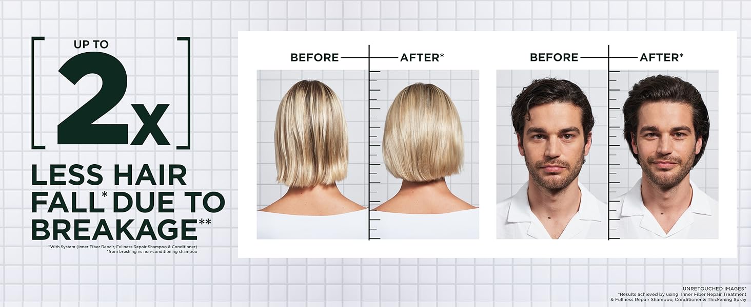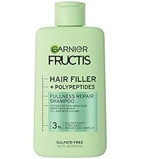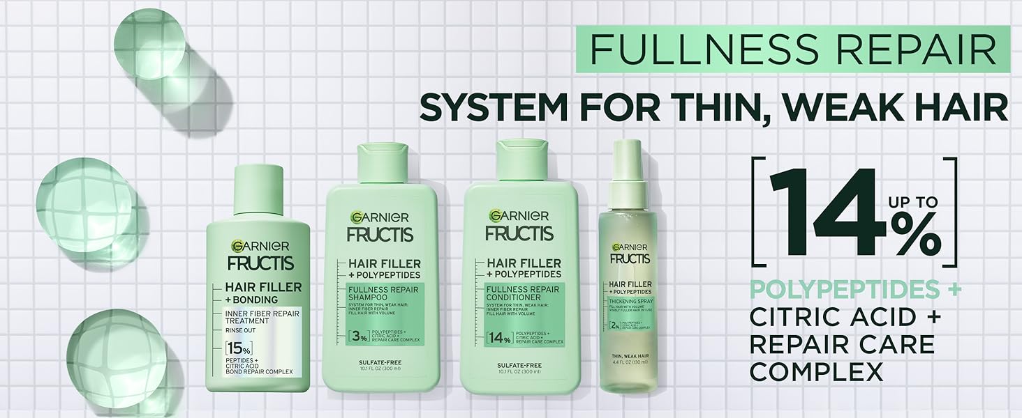 Our Garnier Fructis Hair Filler Fullness Repair system formulated with Polypeptides + Citric Acid + Repair Care Complex fills Thin, Weak hair with Volume. Fill hair with Strength 7 Layers Deep with continuous use of system. Reverses up to 1 Year of Damage to hair smoothness in 1 Use. Visibly Fuller, Thicker hair, with up to 2X less hair fall due to breakage from brushing vs non-conditioning shampoo with use of system of inner fiber repair treatment, fullness repair shampoo & conditioner. Formulated without sulfates, silicones, parabens, phthalates, mineral oils and DMDM Hydantoin. Bottle, excluding cap, is made of 100 percent recycled plastic. All Garnier products are approved by Cruelty Free International under the Leaping Bunny Program.